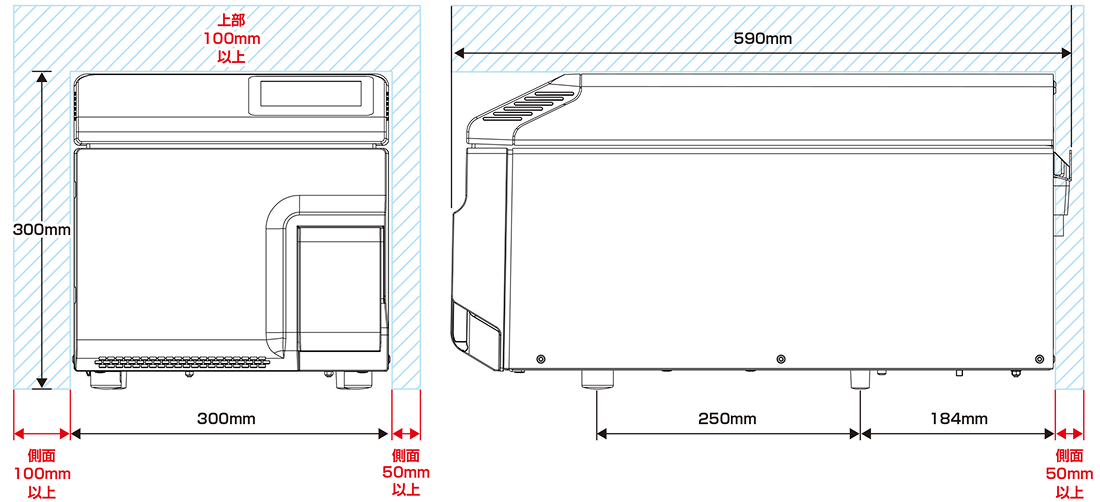 ●左側面100mm以上、右側面50mm以上、背面50mm以上、上部100mm以上(上部に何も無い解放状態が推奨)の空きスペースを確保してください。