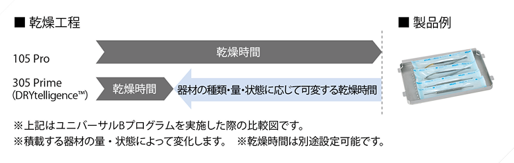 * バキュクレーブ® 305 PrimeはドライテリジェンスをONにした場合、乾燥時間が自動で調整されます。(但し、フレックスドライ機能で設定した時間を上限とする。)