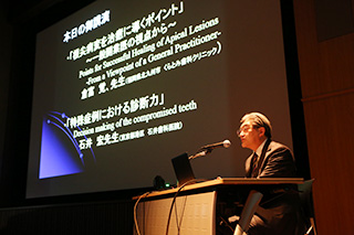 石井 宏先生は「特殊症例における診断力」と題した講演で、根尖性歯周炎以外の問題を抱えた“compromised tooth”のケースを紹介された。歯内療法の目的は根尖性歯周炎予防や治療、歯の保存にあるが、真の患者利益につながる歯内療法の臨床的基準を持つ必要性を語られ、そのためにも患者さんと十分なコミュニケーションをとっていかなければならないと述べられた。
